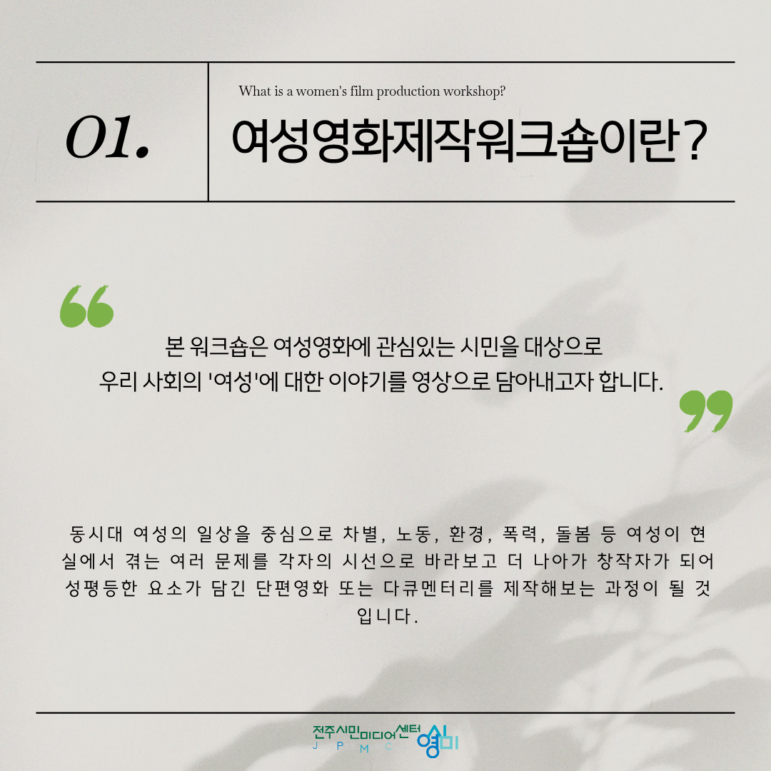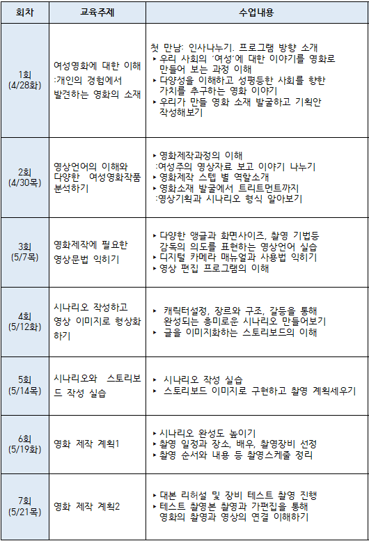 본 워크숍은 여성영화에 관심 있는 시민을 대상으로 우리 사회의 ‘여성’에 대한 이야기를 영상으로 담아내고자
